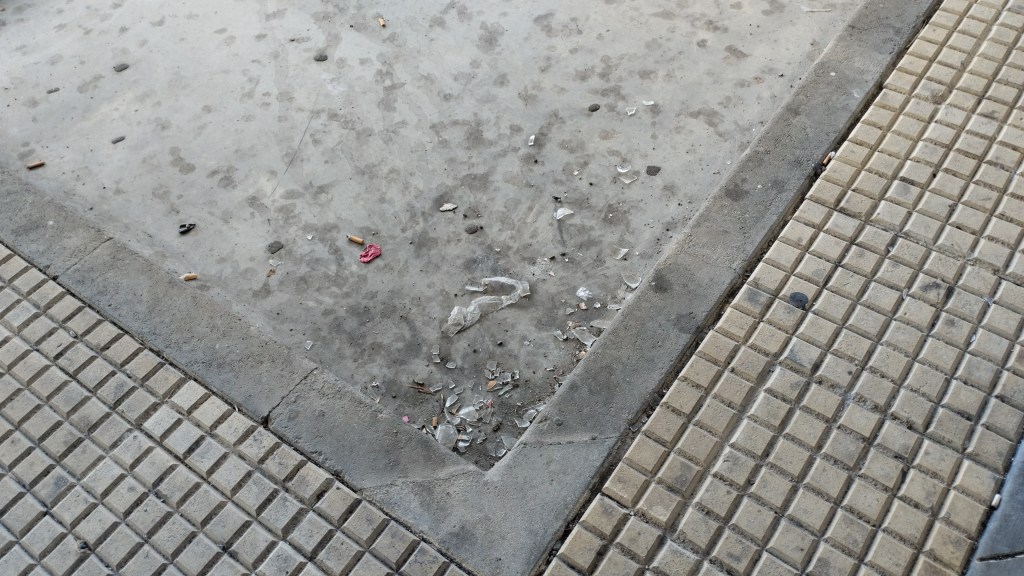 Jardineras que son ceniceros, cristaleras llenas de chorretones , papeleras repletas, cristales rotos por el suelo, basura por todas partes …es lo que te encuentras en un edificio público .